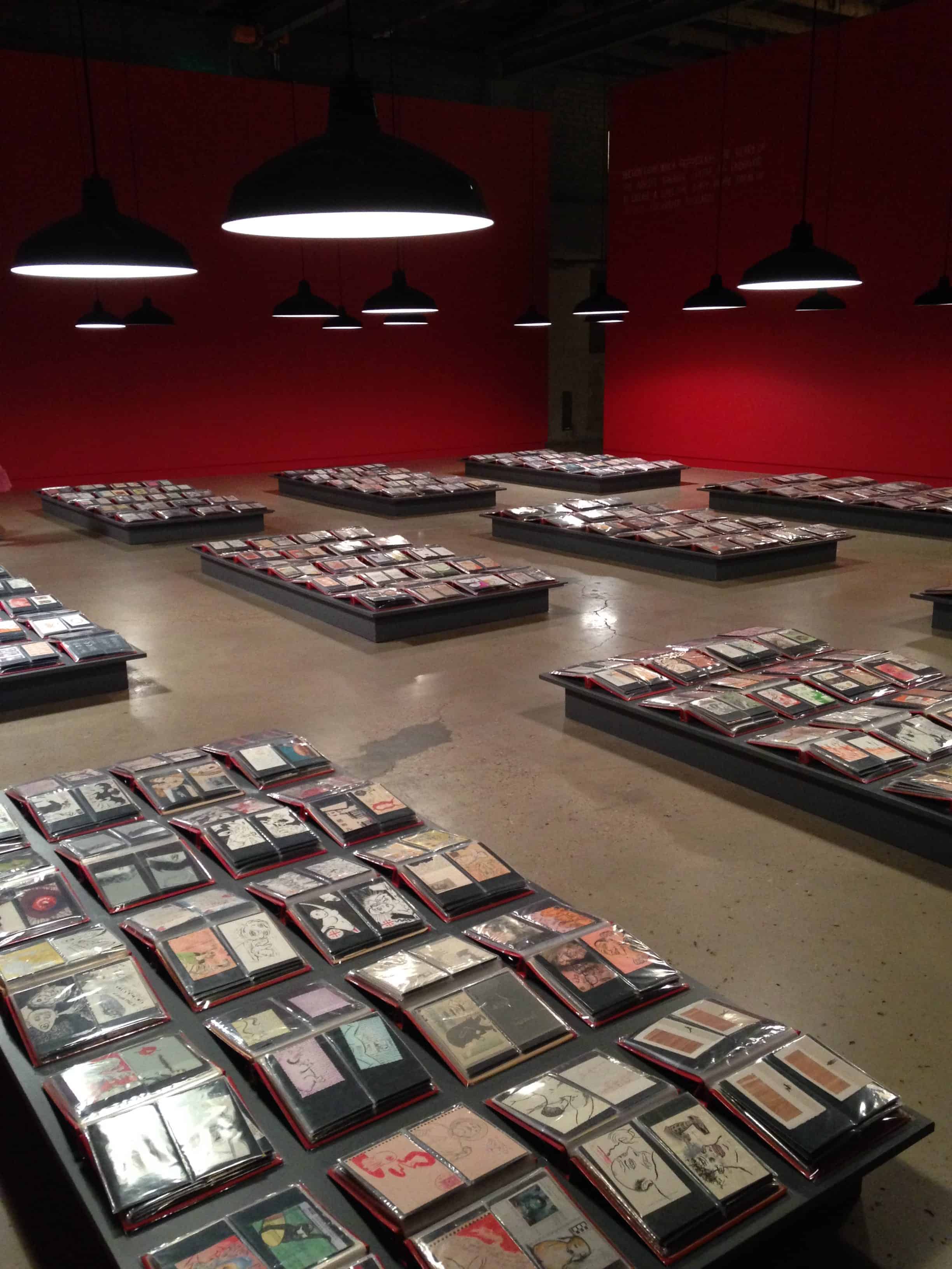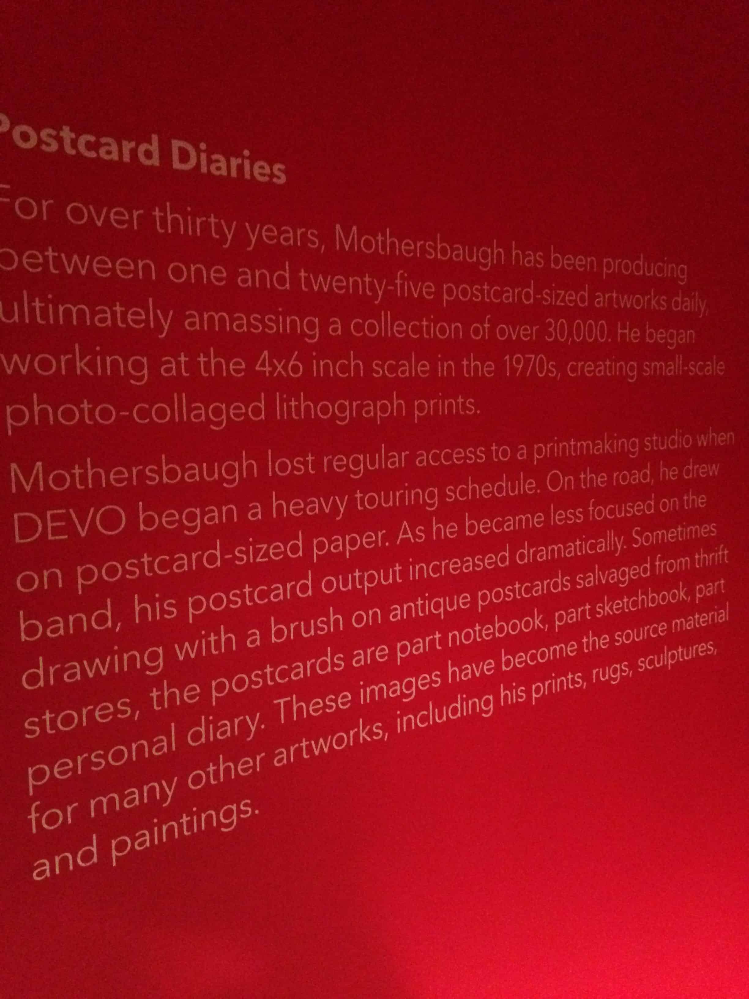 Back downtown, Contemporary Austin had an incredibly unique exhibit featuring the works of Mark Mothersbaugh, whom most of us know from the band Devo. It was strange because, well, that guy is strange. I say that with the utmost respect for his creativity, especially the postcard segment of the exhibit. Since the 1970s, Mothersbaugh has been drawing between one and twenty-five postcard-sized pieces of work every. single. day. Contemporary Austin had the many, many binders and the many, many pages on display. One could flip through them seemingly endlessly. I was so inspired by this commitment to a daily practice that I’ve blocked off a work retreat in my near future.